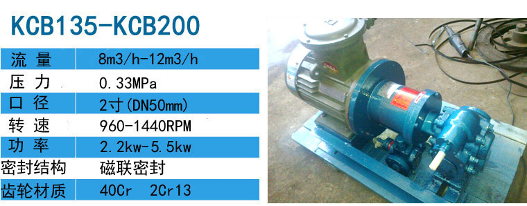 KCB型磁力齒輪泵適用于石化行業(yè)工藝流程中輸送不含固體顆粒和纖維,溫度不高于350℃粘度為5~1500cst的有一定潤滑性的流體。KCB型磁力傳動齒輪泵杜絕了以往齒輪泵的跑、冒、滴、漏的現(xiàn)象,使齒輪泵不會產(chǎn)生泄漏,運行平穩(wěn)、噪音低、是化工行業(yè)、實驗設(shè)備及真空設(shè)備行業(yè)、蒸餾行業(yè)的配套產(chǎn)品。是專為不能發(fā)生液體泄漏場合而設(shè)計的,可用于各種液體的取樣、輸送、分發(fā)、循環(huán)、罐裝等行業(yè),特別適合于有腐蝕、有毒、污染、滲透性強、昂貴介質(zhì)的輸送。
